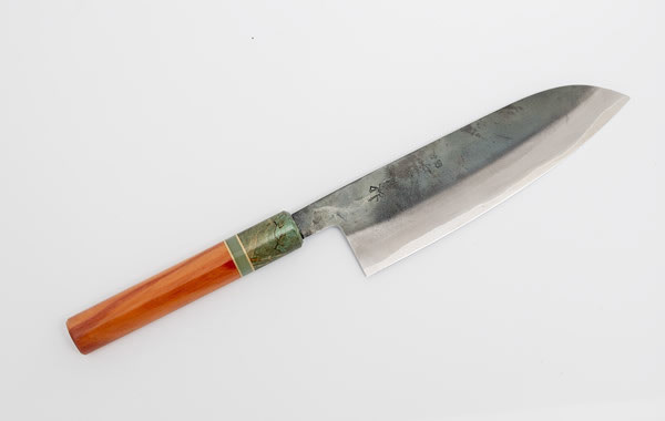 Gyuto en Santoku. Burnt oak handvatten